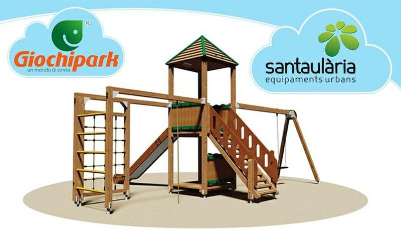 Santaulària Equipamentos Urbanos a realizado la instalacion de una Torreta Multijuego - CARACAS 404 y el cercado perimetral con valla Inglesa de madera tratada al autoclave CL4. Este parque infantil esta pensado para que los mas pequeños se puedan divertir sin correr riesgos dentro de la zona de juego.