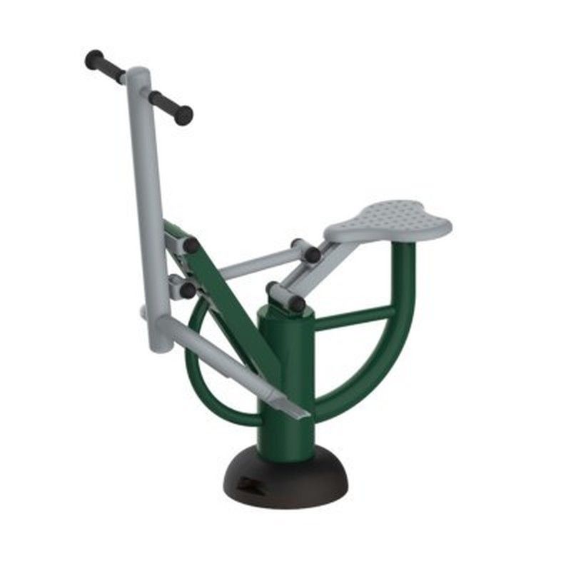 - Material: Estructura de acero pregalvanizado acabado con imprimación + esmalte poliéster al horno de color gris y verde. Mecanismos formados por ejes galvanizados y rodamientos autolubricados.
