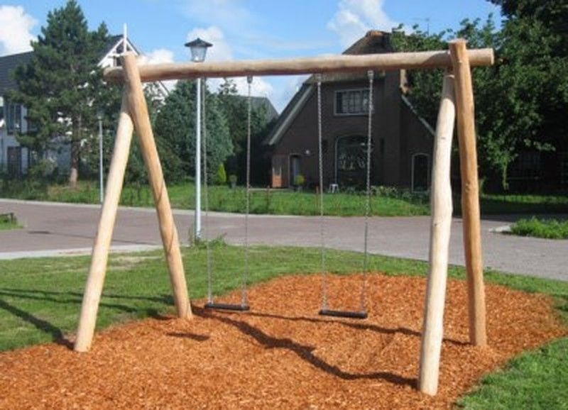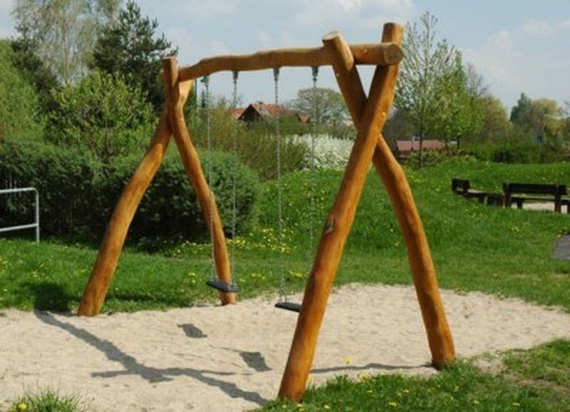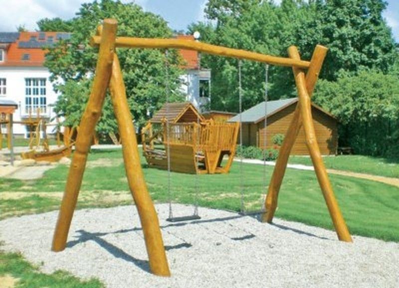 Columpio modelo DOBLE 200 1.02. con dos asientos planos de caucho anti-deslizante. Columpio muy resistente y decorativo, tallado a mano y fabricado con madera de robinia. Este columpio cumple con las normas europeas EN 1176 por el TÜV alemán - Product Service.