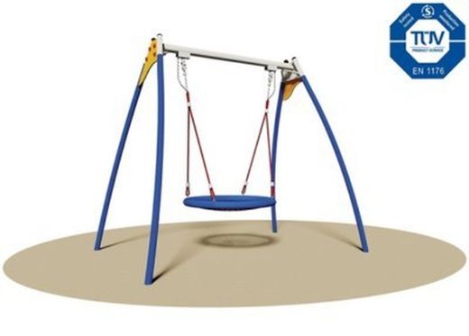 - Columpio:Asiento cuna de Ø 100 cm, fabricado con un trenzado de cuerdas sintéticas de colores con núcleo interno de acero y cadena de malla galvanizada unida a la viga con un doble dispositivo de fijación especial.