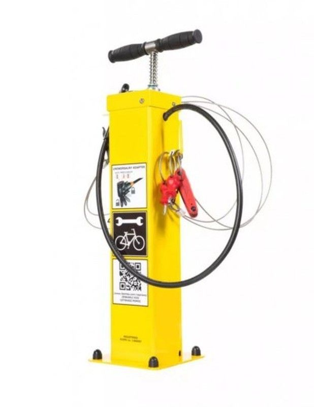 Estación de reparación modelo B6, ideal para reparar todo tipo de bicicletas, patinetes, monopatines o sillas de ruedas. Dispone de 6 herramientas sujetas con cuerdas de acero inoxidable, recubiertas de plástico que permiten llegar a todos los componentes y realizar un autoservicio de reparación, sin dañar el medio de transporte. Incorpora una bomba manual con adaptador para todo tipo de válvulas y un gancho lateral. La estación de reparación con unas dimensiones de 71x20x20cm permite la rotulación con una área publicitaria de 2500 cm2. Este modelo puede incorporar una placa de tierra de instalación móvil que permite desmontar y montar la estación, fijado sobre un elemento duradero existente con una cuerda de acero y un candado.
