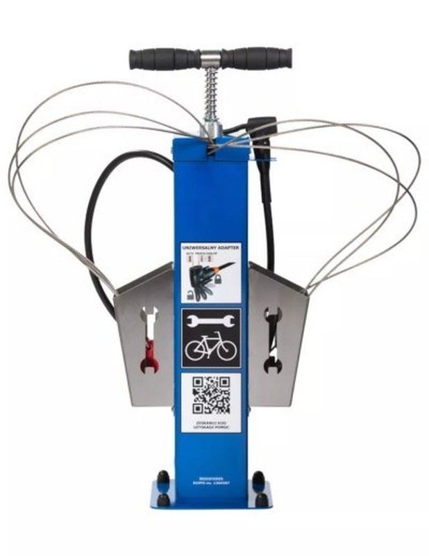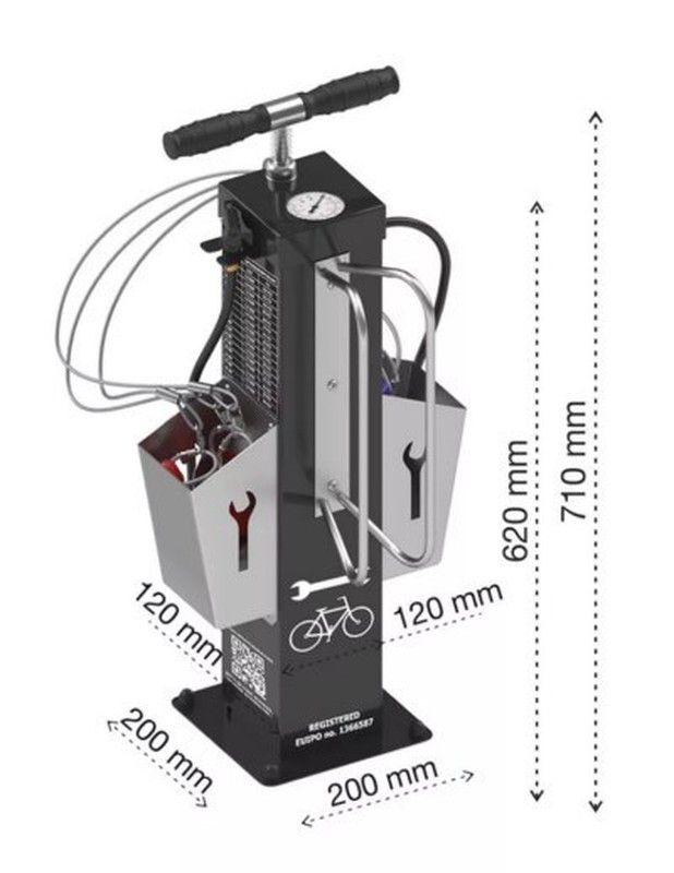 Estación de reparación modelo B6B, ideal para reparar todo tipo de bicicletas, patinetes, monopatines o sillas de ruedas. Dispone de 6 herramientas sujetas con cuerdas de acero inoxidable, recubiertas de plástico que permiten llegar a todos los componentes y realizar un autoservicio de reparación, sin dañar el medio de transporte. Incorpora 2 cestas para las herramientas, una bomba manual con adaptador para todo tipo de válvulas y un gancho lateral. La estación de reparación con unas dimensiones de 71x32x33cm permite la rotulación con una área publicitaria de 1500 cm2. Este modelo puede incorporar una placa de tierra de instalación móvil que permite desmontar y montar la estación, fijado sobre un elemento duradero existente con una cuerda de acero y un candado.