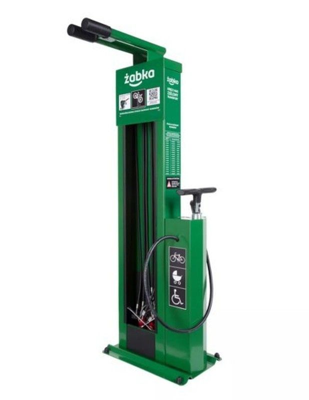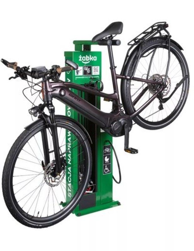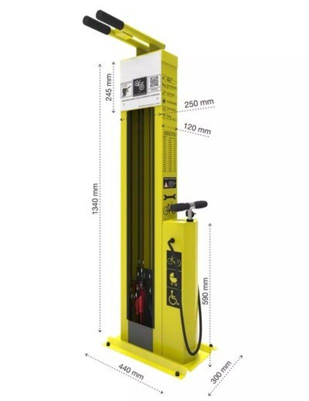 Estación de reparación modelo T12, ideal para reparar todo tipo de bicicletas, patinetes, monopatines o sillas de ruedas. Dispone de 12 herramientas sujetas con cuerdas de acero inoxidable, recubiertas de plástico que permiten llegar a todos los componentes y realizar un autoservicio de reparación, sin dañar el medio de transporte. Incorpora una bomba manual con adaptador para todo tipo de válvulas y opcionalmente gancho para colgar la bicicleta. La estación de reparación con unas dimensiones de 134x44x30cm permite la rotulación con una área publicitaria de 8000 cm2.