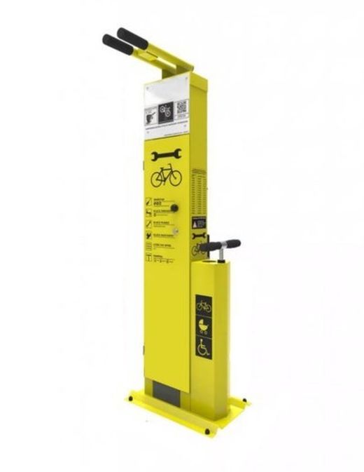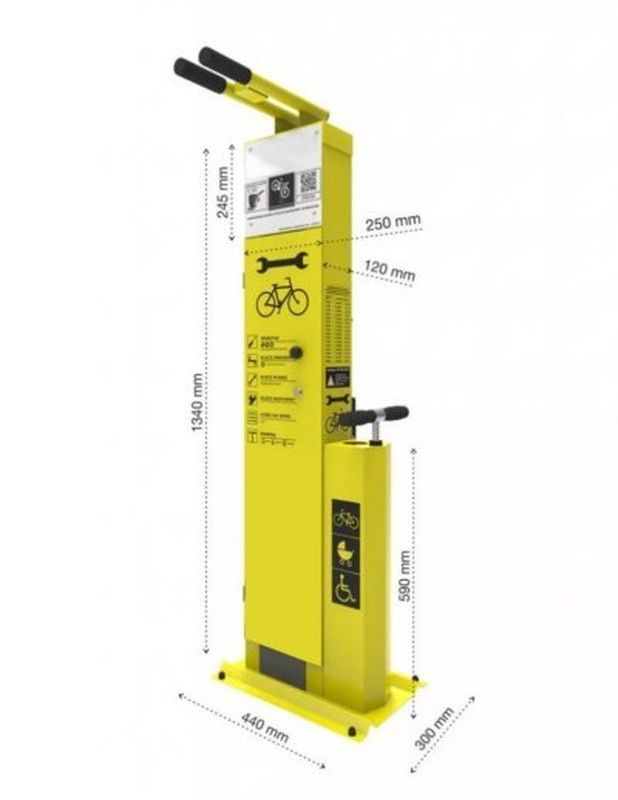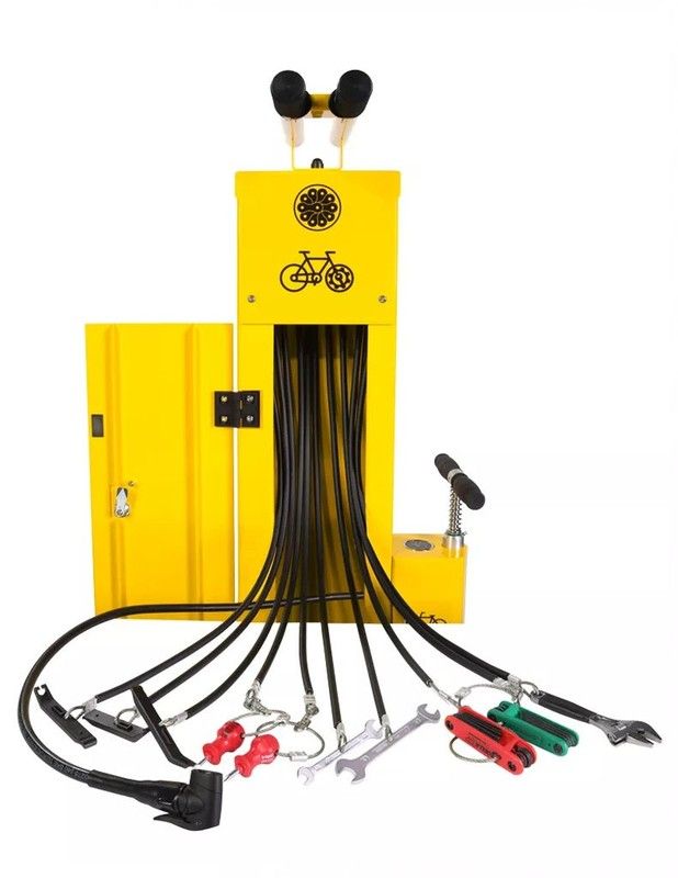Estación de reparación modelo T12D con puerta, ideal para reparar todo tipo de bicicletas, patinetes o sillas de ruedas. Dispone de 12 herramientas sujetas con cuerdas de acero inoxidable, recubiertas de plástico que permiten llegar a todos los componentes y realizar un autoservicio de reparación, sin dañar el medio de transporte. Incorpora una bomba manual con adaptador para todo tipo de válvulas y opcionalmente gancho para colgar la bicicleta. Este modelo incorporar una puerta con bisagras sólidas, pensado para horarios de apertura de locales públicos o privados. Posibilidad de incorporar un sistema adicional de apertura mediante monedas o cerradura con llave, para poder proteger las herramientas. La estación de reparación con unas dimensiones de 134x44x30cm permite la rotulación con una área publicitaria de 11000 cm2.