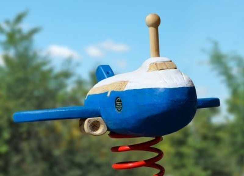 Juego de muelle con forma de Avión, modelo 4.07, tallado a mano y fabricado con madera de robinia con un muelle de acero barnizado al horno con dispositivo antipinzamiento de dedos. Este juego de muelle cumple con las normas europeas EN 1176 por el TÜV alemán - Product Service.