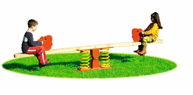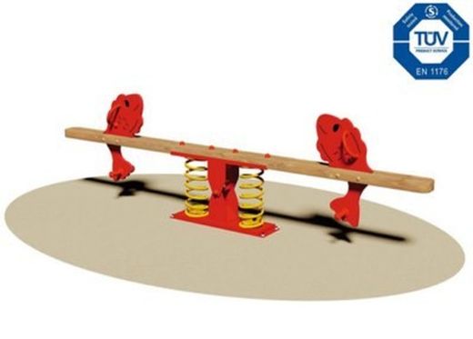 - Estructura: La estructura consiste en una viga central de madera con asienos, fijado a una base de acero galvanizado pintado en caliente con dos muelles de acero, barnizado y completado con dispositivo antipinzamiento de dedos.