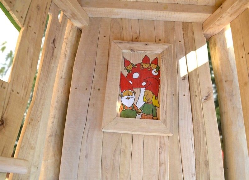 Juego infantil de madera de Robinia TORRETA MULTIJUEGO CASA GNOMO 10.09., tallado a mano y fabricado con madera de robinia. Esta torreta multijuego de robinia cumple con las normas europeas EN 1176 por el TÜV alemán - Product Service.