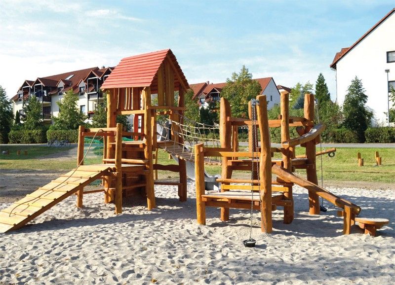 Juego infantil de madera de Robinia TORRETA MULTIJUEGO PLAZA DEL PUEBLO 10.19., tallado a mano y fabricado con madera de robinia. Esta torreta multijuego de robinia cumple con las normas europeas EN 1176 por el TÜV alemán - Product Service.