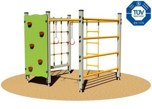 - Pared de escalada: Fabricada con un panel de HDPE con zapatas de resina de colores constituyentes un muro de escalada.