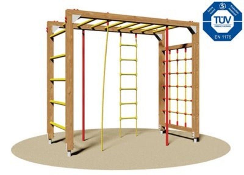 Multijuego ECUADOR - 741 con escaleras y cuerda, pared sueca, red de escalada y dos barras deslizadoras. Certificado de conformidad con las normas europeas EN 1176 por el TÜV alemán - Product Service.