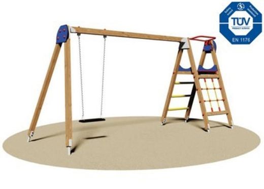 Columpio: Asiento plano de caucho anti-deslizante con núcleo interno de aluminio y con cadenas galvanizadas en caliente con paso de malla estrecho para evitar el aprisionamiento de los dedos.
