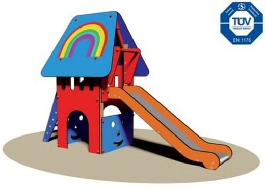 - Tobogán: de 80 cm, con pista de acero inoxidable y paneles protectores en los laterales. Equipado con tubo de seguridad de acero pintado en caliente en forma de maníja.