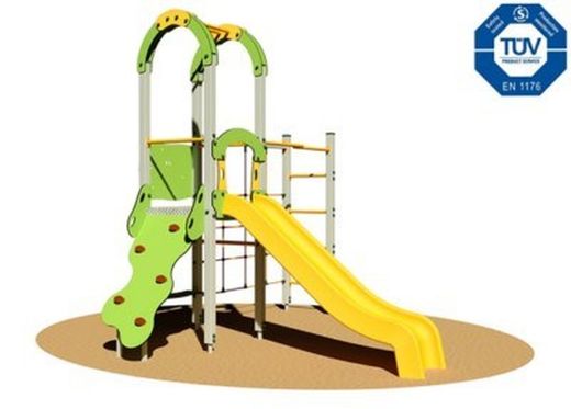 - Tobogán: Fabricado en polietileno de alta densidad de 150 cm de altura, equipado con un panel de seguridad arqueado en HPL.