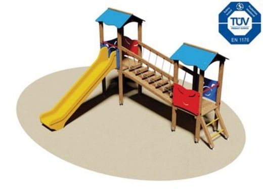 - Torreta: 1 Torreta de 100 x 100 x 315 cm con tejado en HPL a dos aguas y una segunda torreta de 100 x 100 x 271 cm con tejado en HPL a dos aguas. Las torretas están fabricadas con postes de madera laminada de 9 x 9 cm, 2 plataformas de madera tratada, 4 paneles protectores en los laterales en contrachapado de okume pegado fenólicamente con los bordes redondeados.